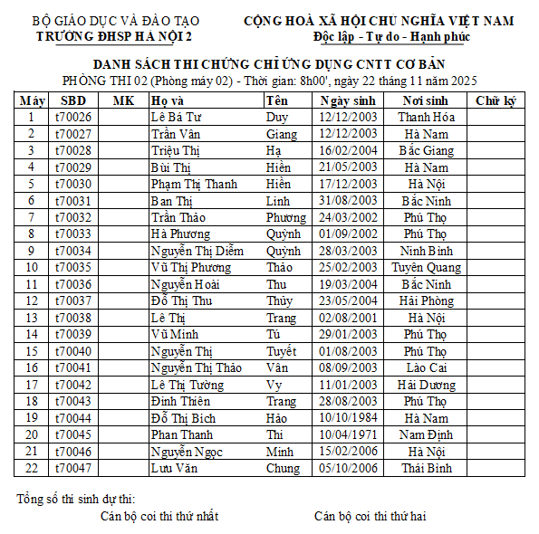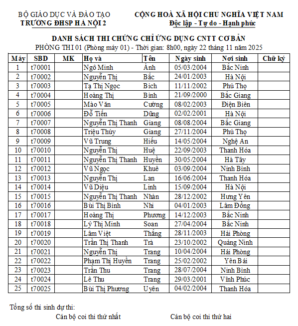 Trung tâm Tin học thông báo thời gian biểu và danh sách thi chứng chỉ ƯDCNTT cơ bản ngày thi 22/11/2025 cụ thể như sau: